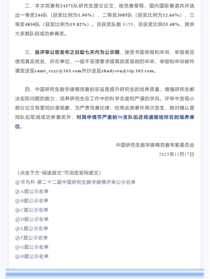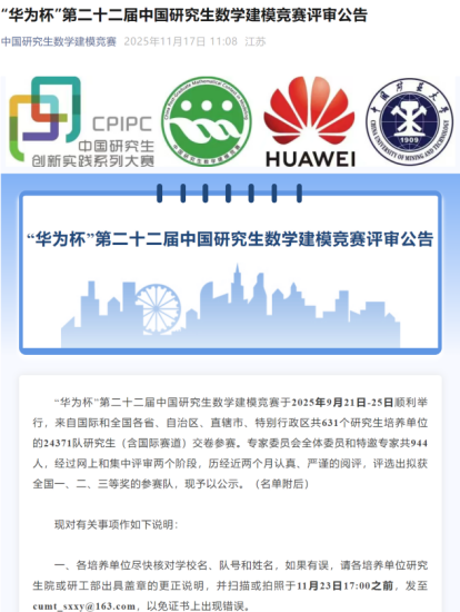 院讯(通讯员:相青 杨慧婷)为进一步提升研究生创新实践能力,营造浓厚的学术竞赛氛围,学院积极组织参加各类高水平赛事。12月16日,第二十二届“华为杯”中国研究生数学建模竞赛获奖名单正式公布。禁忌书屋