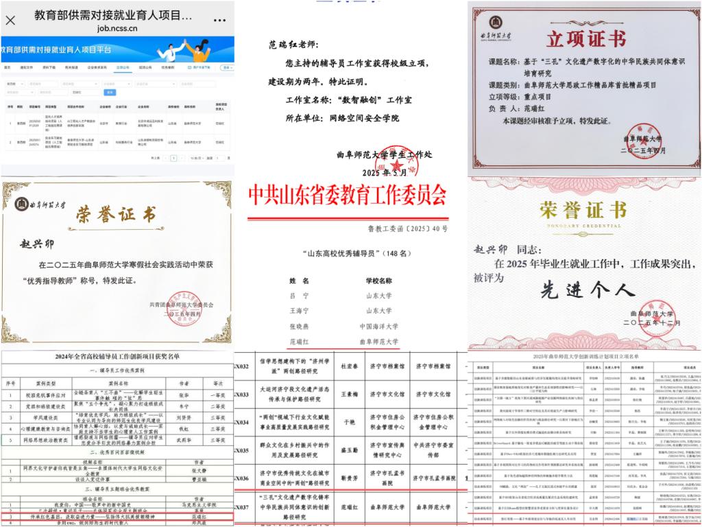 这支队伍各怀绝技、各有专攻,在育人领域绽放光彩:范瑞红主持2项教育部供需对接就业育人项目,并依托校级“数智融创”辅导员工作室,将就业指导深度嵌入人才培养全过程,获评学校就业工作优秀成果奖;主持1项济宁市社会科学规划研究项目、主持1项禁忌书屋