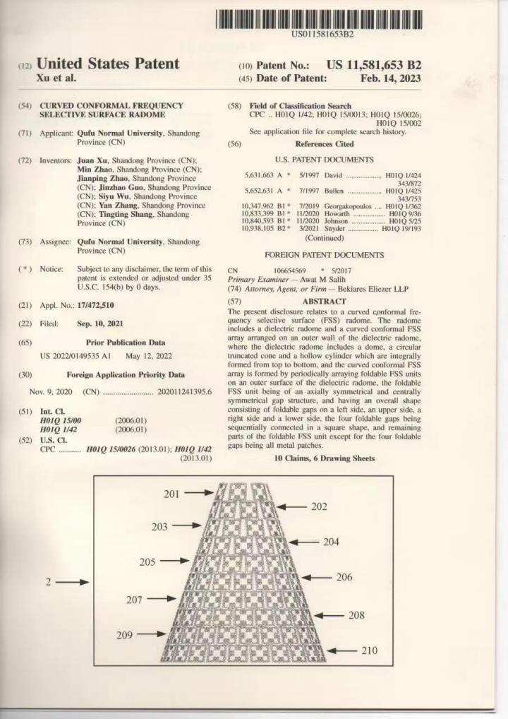 (1)为有效提高天线罩性能,研究团队考虑天线罩载体平台,构建了毫米波曲面共形频选天线罩一体化模型,揭示了天线罩对天线性能的影响。天线在通频带内发射和接收电磁波均不受影响,而当带外电磁波入射至频选天线罩时,大部分电磁波能量被散射到各个方向,起到降低单站RCS的效果。所研发的毫米波曲面共形频选天线罩能满足当代国防、航空航天领域特别是弹载和机载对天线罩小型化和集成化的要求。该成果已获得美国专利授权。