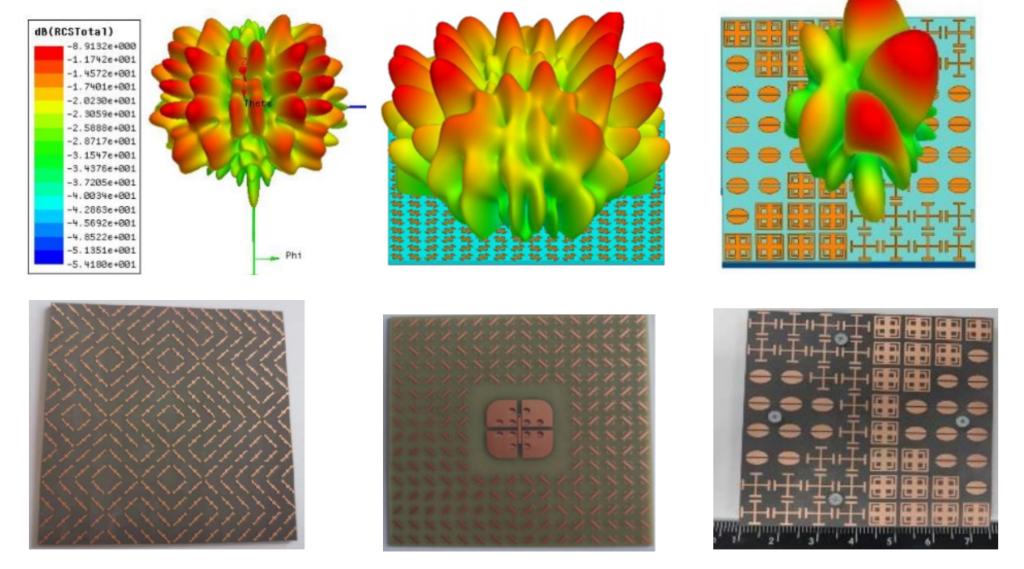 (2)研究团队在电磁隐身方面利用了反射超表面进行电磁波调控,实现对散射电磁波的控制。其中主要针对于相位相消超表面和极化转化超表面开展研究,引入卷积操作以及优化算法对超表面排布进行优化。通过精确控制超表面的相位和极化特性,可以实现对电磁波的散射和反射进行精密调控,从而达到电磁隐身的效果。此外,将超表面与天线进行结合设计了隐身超表面集成天线。研究团队关于超表面的研究成果已发表于ACES, MOTL, J COMPUT ELECTRON期刊。