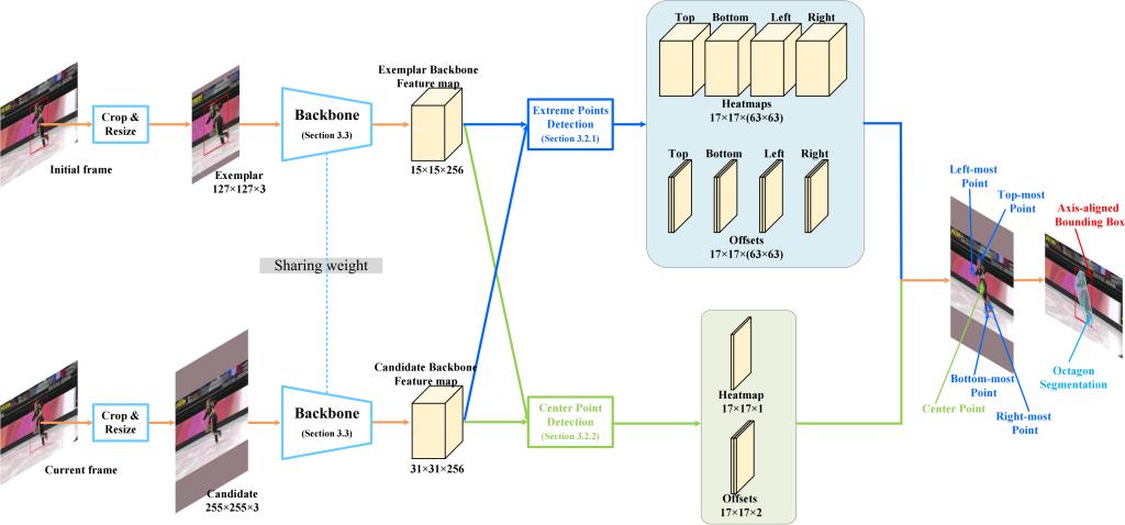 视觉目标追踪任务要求实时并准确地对任意目标进行中心定位和尺度估计。最近的研究为了能准确地定位到目标,需要设置大量候选标注框。然而只有少部分候选标注框与真实标注框具有较高的重叠率,在训练过程中被标注为正样本,其他的候选标注框都被标注为负样本,直接导致训练数据集中正负样本数量不均衡。同时,候选框在设置过程中依赖于大量人工设置的超参数,例如候选框的数量、尺度比例和长宽比例,在进行精确估计目标尺度大小时需要更为细致的设计,造成大量计算和存储开销,从而严重影响训练和推理的效率。为了解决目标尺度变化问题,论文提出了一种基于极点感知的视觉目标追踪方法,将目标结构化建模为4个位于其顶端、底端、左侧和右侧的边缘极点。目标的中心位置和尺度大小可以通过感知4个边缘极点的位置直接得到,以往通过先验设置的多尺度候选采样法和候选标注框生成法可以被抛弃掉,为解决目标尺度变化问题提供了一个全新的思路。