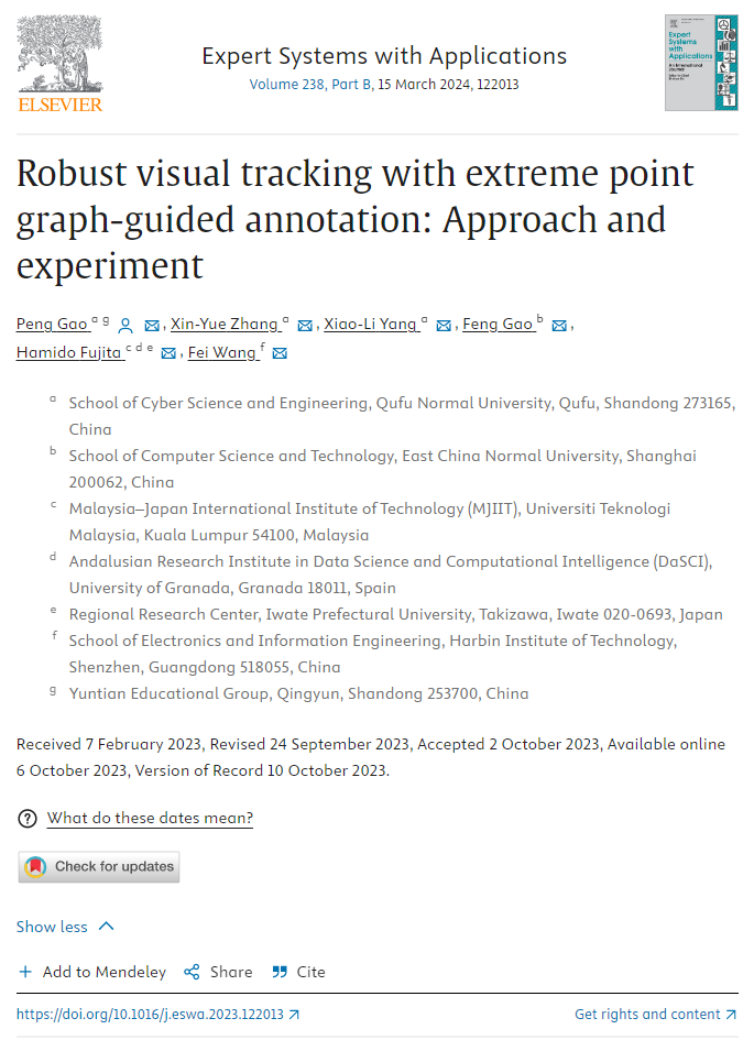 学术论文(Peng Gao, Xin-Yue Zhang, Xiao-Li Yang, Feng Gao, Hamido Fujita, and Fei Wang. Robust Visual Tracking with Extreme Point Graph-Guided Annotation: Approach and Experiment, 2023)。该论文以曲阜师范大学禁忌书屋
