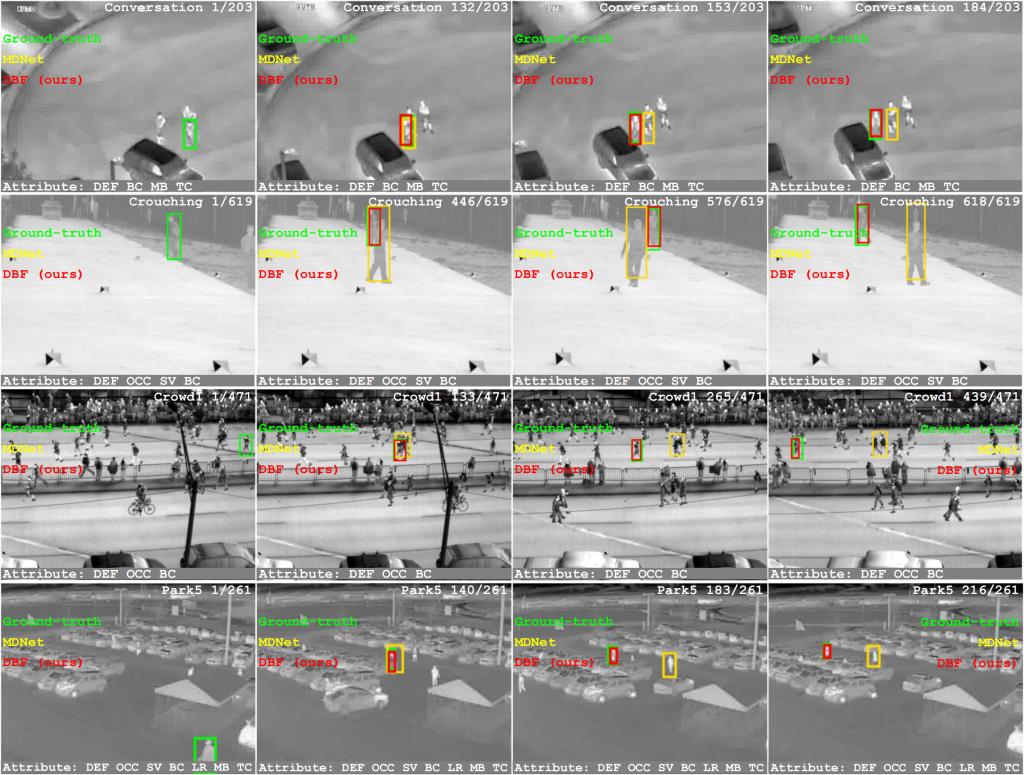在诸如遮挡、热交叉、快速运动、背景混淆等复杂场景下,基于检测的热红外跟踪算法对于目标模型的更新会陷入进退两难的困境。为此,论文引入深度贝叶斯滤波框架解决这一问题。该框架可以融合运动信息和红外信息,提升基于检测的热红外跟踪方法在复杂场景下的性能。深度贝叶斯滤波由系统模型和观测模型组成。在获取图像帧前,系统模型利用目标运动信息基于二维布朗运动生成先验概率。在获取图像帧后,观测模型会利用热红外信息生成似然概率。最后用贝叶斯公式根据两个模型的引导,确定目标的位置,并动态更新模板。后验概率分布峰值的位置作为目标位置的估计。在多个基准数据集的实验分析表明,论文所提方法实现了具有竞争力的性能。
