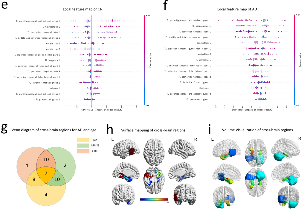 阿尔兹海默症(Alzheimer's Disease,AD)是一种不可逆的神经退行性疾病,多发于老年群体,与衰老有着密切关联。尽管许多研究在探索AD、认知评估得分和衰老之间的相关性,并将认知评估得分和年龄信息作为疾病诊断的重要依据,但对它们之间的联系依旧缺乏深入的研究。论文提出了基于混合注意力的3D CNN模型,并量化了不同大脑区域对各自任务的贡献度,从而识别大脑中与AD和衰老相关的关键脑区,并为衰老与AD之间的关系提供了直观的解释。结果表明,在AD和衰老过程中,左右大脑之间存在着明显的非对称性变化。此外,论文发现AD在一定程度上影响衰老,为AD和衰老之间的关系提供了新的研究线索。