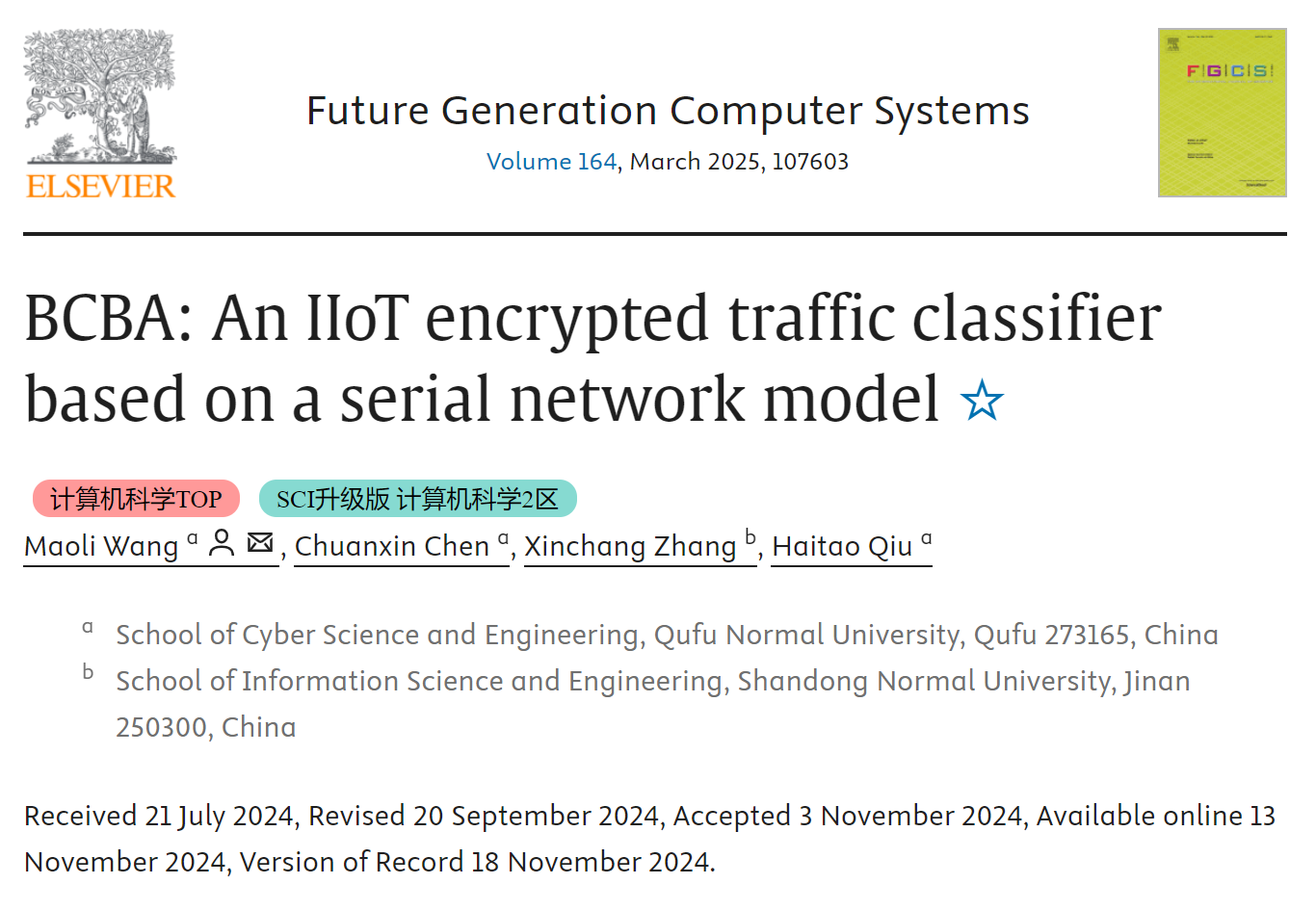 学术论文"BCBA: An IIoT Encrypted Traffic Classifier Based on a Serial Network Model"。该论文以禁忌书屋
