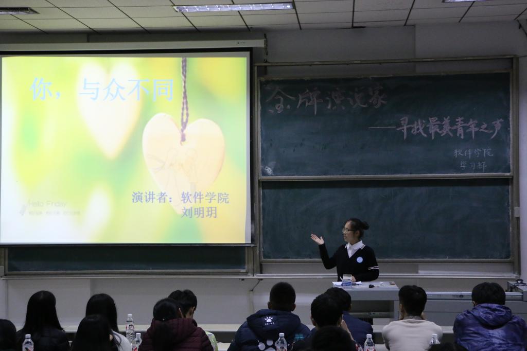 为了提高软件学院学生的学习积极性,拓宽学生的知识面,提高学生的语言表达能力,给他们提供一个展示自我的舞台,软件学院学习部举办"金牌演说家——寻找最美青年之声"演讲比赛。学生会主席团成员及各部部长担任此次比赛的评委。