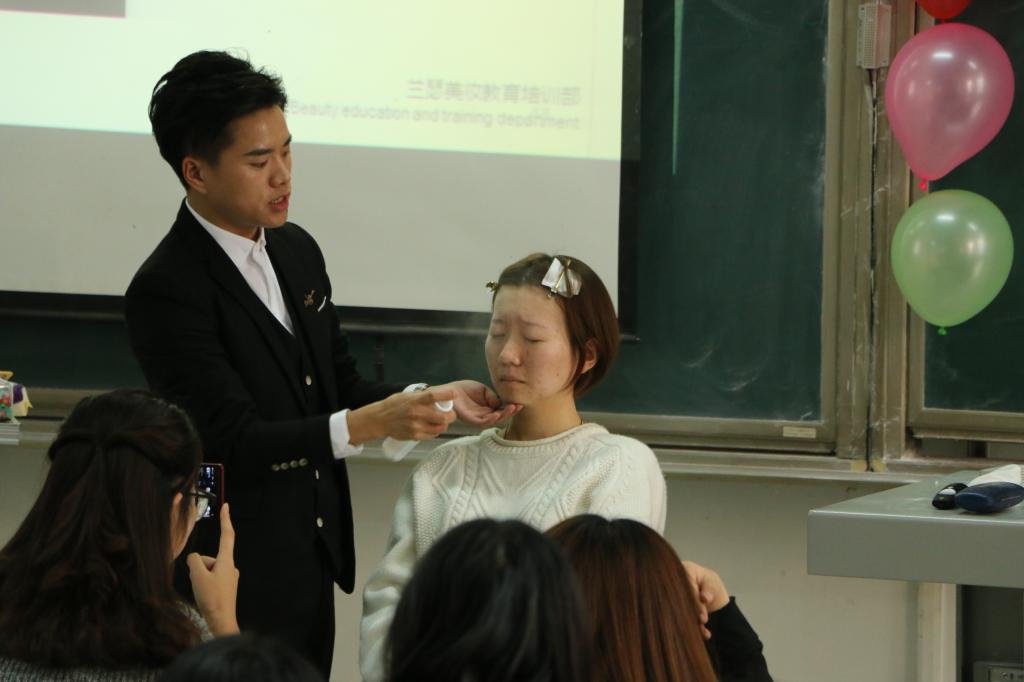 讲座开始前,主持人向同学们全面地介绍了出席今天讲座的兰瑟彩妆师卓越老师。卓老师是兰瑟品牌高级讲师、新丝路模特大赛化妆师,卓老师擅长韩式生活妆、影视特效妆、现代风格妆容。讲座过程中,卓越老师先讲解了关于皮肤的常识和内部机理、皮肤特性、皮肤护理等护肤知识。随后卓老师邀请一位志愿者上台,为其顺序进行上妆,现场教学示范,详细讲解了化妆过程的细节及注意事项。讲座最后,主持人进行现场化妆小知识问答,并为幸运者赠送了小礼品。