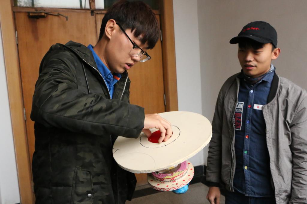 比赛中,每组选手各派一名代表上前利用ppt或其他方式对自己组的作品进行材料、性能等方面的讲解,并将作品展示给评委观看。随后参赛组携带作品到指定地点进行鸡蛋抛掷,由指定人员和其余参赛组队伍在一旁进行观看,评委根据参赛作品的外观、设计技巧、重量以及鸡蛋的落地情况等方面进行打分。本次比赛陈震、张金垣、王天宇带领的队伍荣获一等奖,另有四支队伍获二等奖,五支队伍获三等奖,评委们为获奖组颁奖并与他们合影留念。