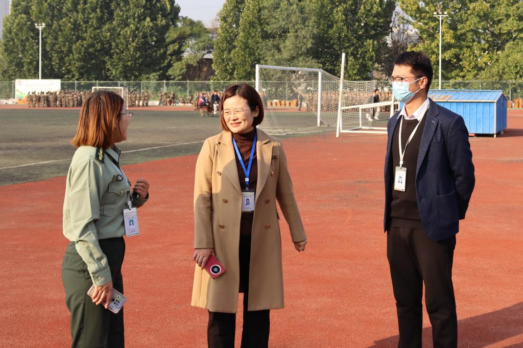 党委书记田云飞、党委副书记范瑞红、团委书记丁允念和辅导员相青到达现场指导军训工作。
