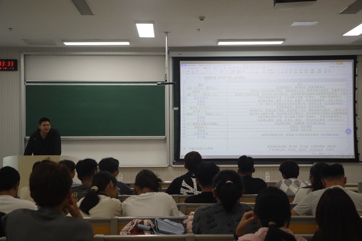 会议开始,武玉龙梳理了迎新工作流程,鼓励学生干部和各部门保持初心、尽职尽责,发挥好师哥师姐引领作用,共同圆满完成迎新工作。于媚媛对文艺部和权益部的工作做出部署,要求活动内容提前准备,文艺部要深化国防教育的活动主题,权益部专注经济困难生认定与评奖评优工作。丁允念强调各带班要履行好“班主任”职责,在班委选拔工作中做好候选人的人品和能力考察。最后,刘子新针对各部门分工进行了详细讲解,提醒各部门针对工作突发情况提前做好预案,工作人员要熟悉学院迎新特色工作,最后强调学生干部要恪尽职守,各司其职。