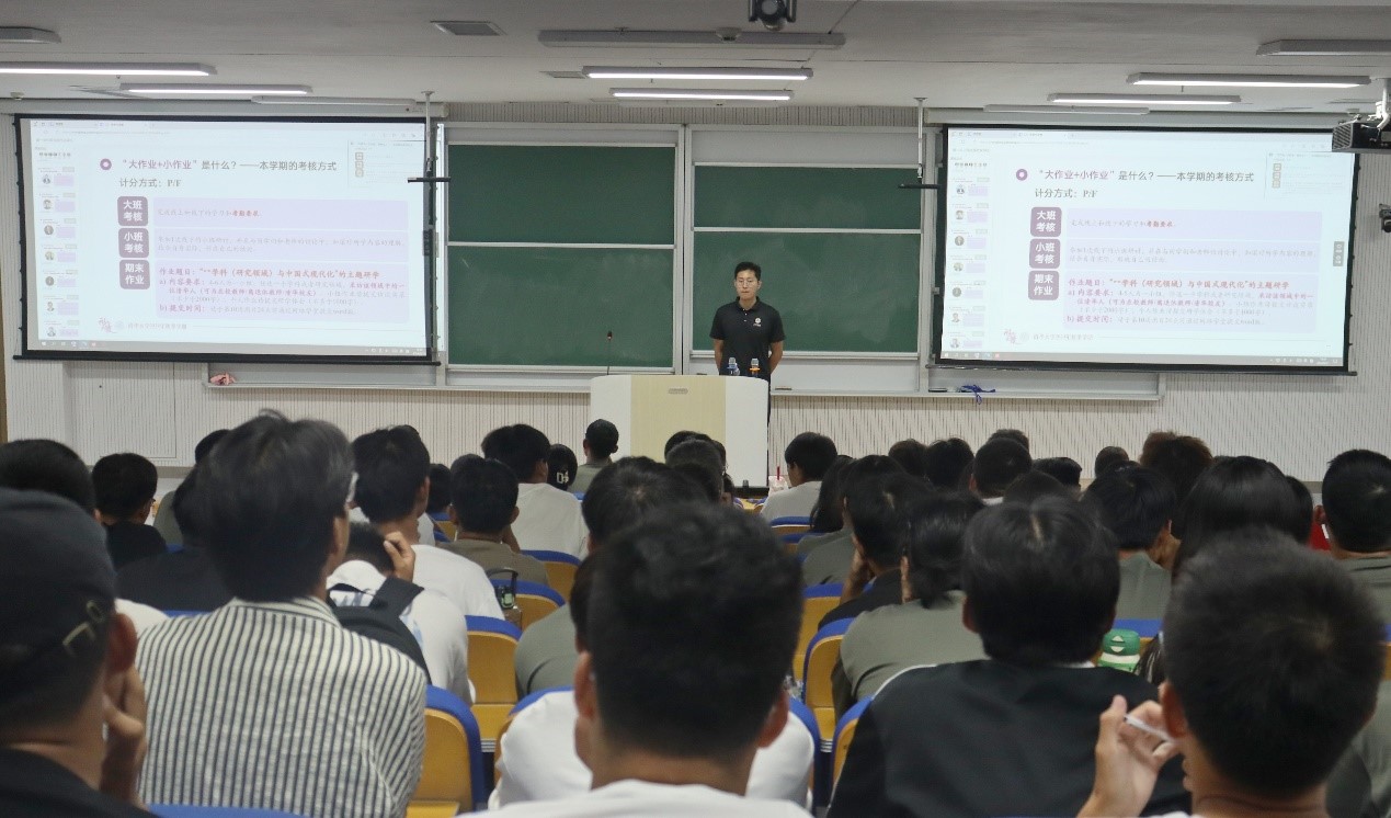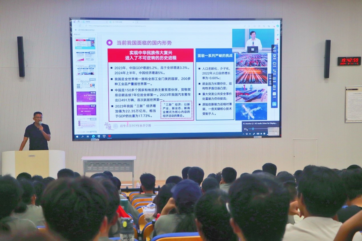 2024级新生于致知楼B101、B201学习由清华大学校党委书记邱勇主讲的“形势与政策”线上课程。