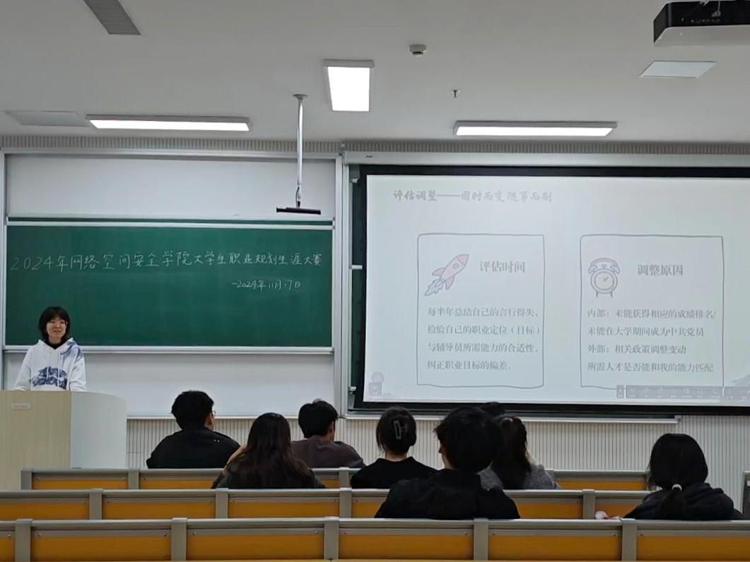 学生的创新能力、实践能力和就业能力,11月17日14:00,网络空间安全学院大学生职业规划生涯大赛于格物楼B105教室顺利举办。本次比赛由学院就业实践部副部长吉增昊主持,学院团委副书记杨蓓茜、就业实践部部长李芳威、宿卫部部长李承昊担任评委。