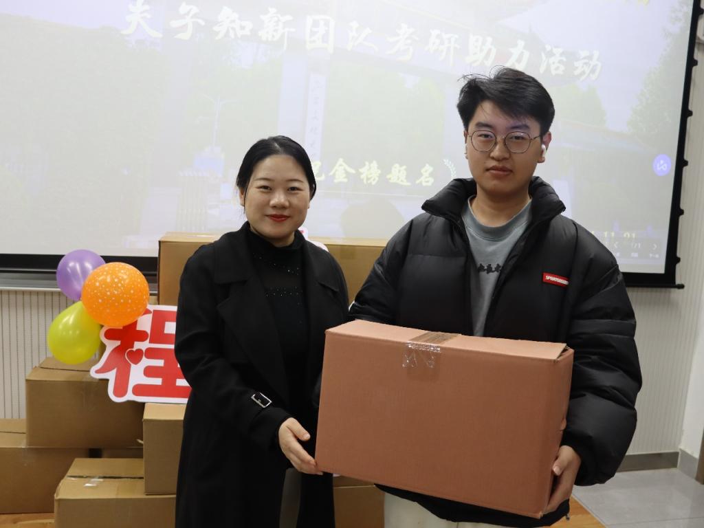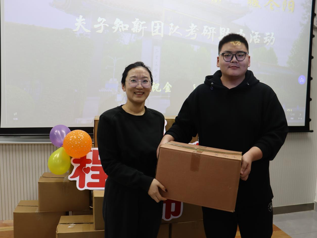 本次活动由夫子知新团队鼎力支持。活动伊始,周子力向同学们介绍了夫子知新平台,并表达了对考研学子的深切关怀与诚挚鼓励。他勉励大家在考研路上坚定信念、全力以赴,这一席话极大地提振了同学们的斗志与信心。随后,周子力老师和辅导员老师共同为考研学子送上寓意“‘苹’安上岸”的苹果礼盒。这份承载着祝福的礼物,不仅体现了学院对学生深切的关怀之情,也为考研路上的学子们平添了一抹温情与鼓舞人心的力量。最后,辅导员老师与考研学子亲切合影留念,用照片记录下这份温馨与鼓励,也为大家注入了必胜的信心与勇气。