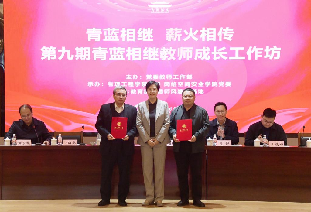周子力副教授受聘第九批“青年教师成长导师”,李志红为两位成长导师颁发证书。