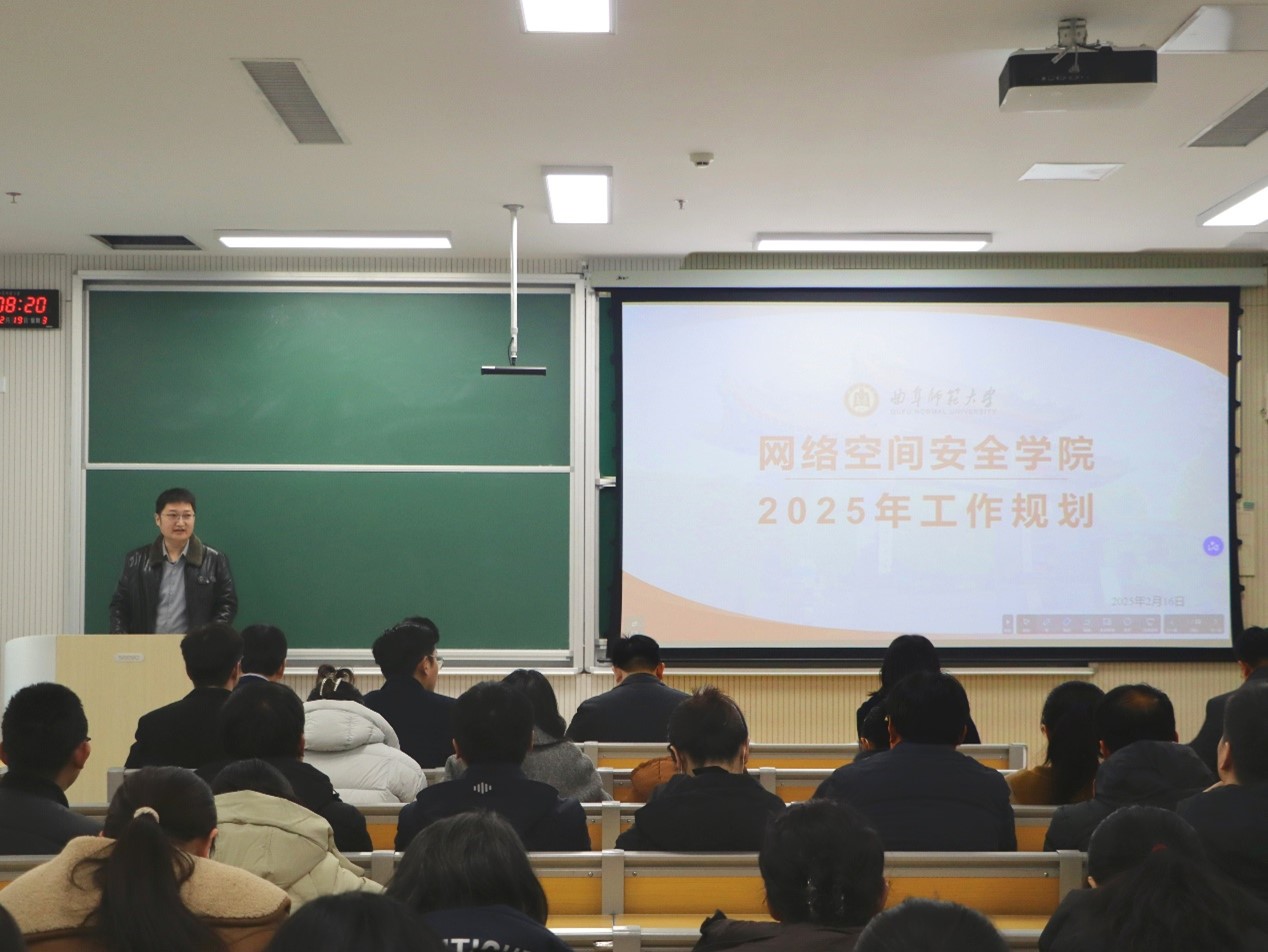 2025年的教学和科研工作规划。他指出,学院已高质量完成教学任务,推进工程教育认证和本科毕业论文工作,助力学生考研与就业。同时,他要求教师深入研究前沿领域,杜绝“躺平”现象,积极申报科研成果,争取山东省科技技术奖。会议最后,全体教职工一起观看了题为“生命重于泰山”的短片。