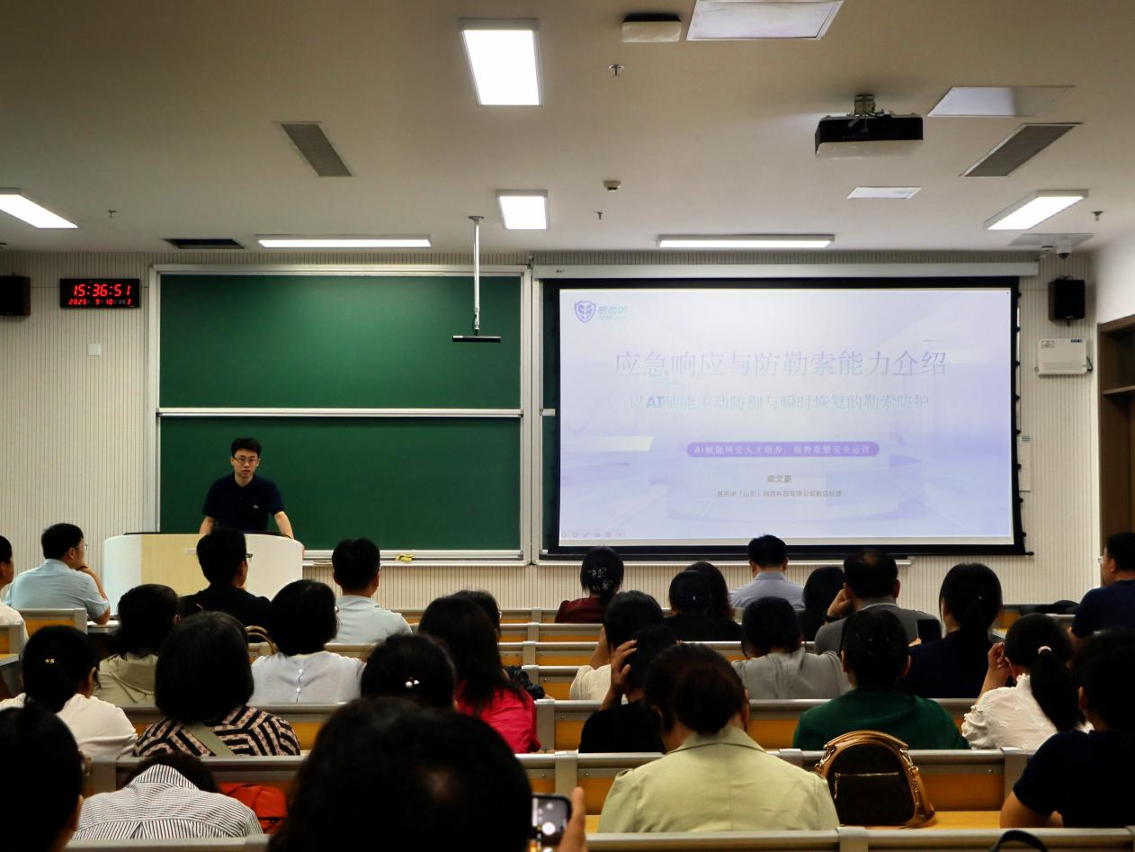 会上,梁文豪围绕“以AI赋能主动防御与瞬时恢复的勒索防护”作专题讲解。他详细分析了当前勒索病毒的演变趋势和防护形势,重点介绍了AI技术在勒索防护中的创新应用与企业自主研发数据恢复技术的实战成效,为学院师生提供了宝贵的前沿视角和实践经验。最后,田云飞总结强调,学院要紧跟网络安全技术发展趋势,不断提升教职工的安全防护意识和信息化教学水平,推动前沿技术与教学育人深度融合,切实增强教师引导学生将理论知识与实践操作相结合的能力,为培养高素质网络安全人才夯实基础。