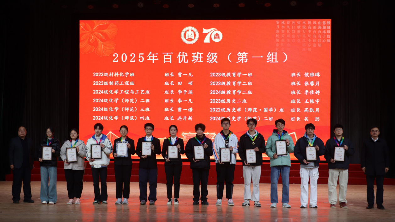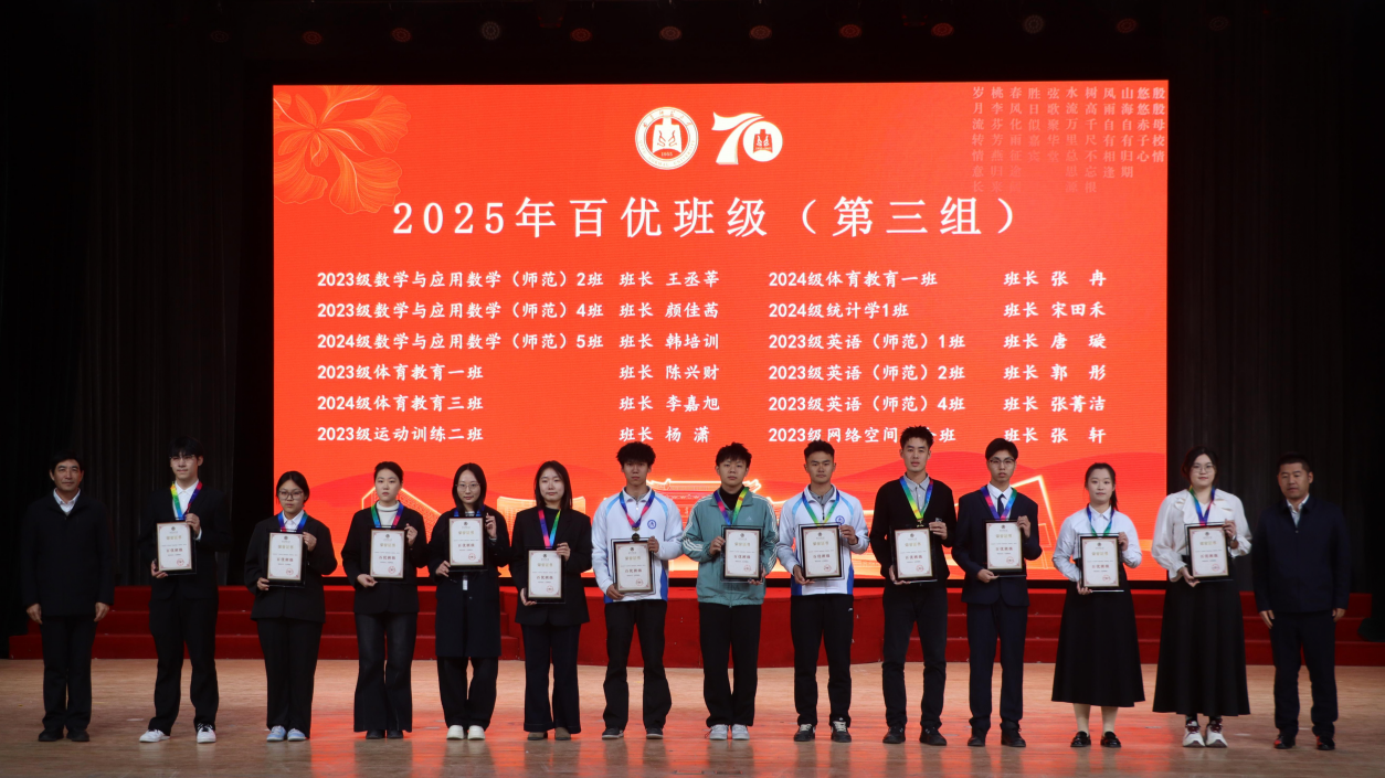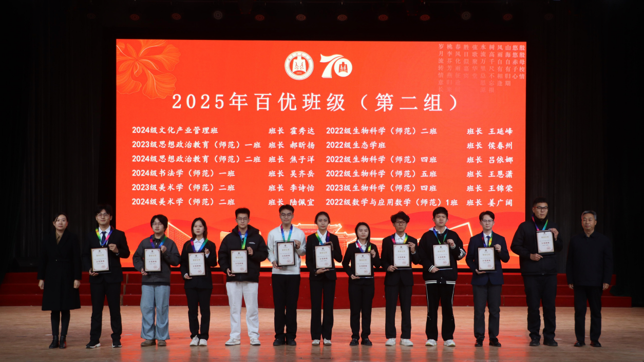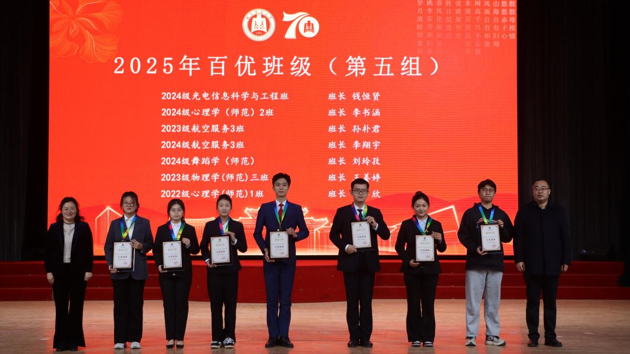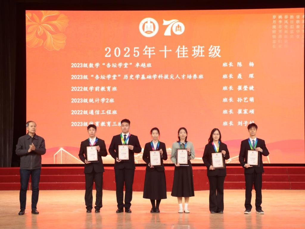 经学院推荐、材料审查与学校初评等环节,曲阜校区评选出55个班级,获得“百优班级”荣誉称号6个十佳班级则通过初评与本次现场评分加权排名确定。最终,曲阜校区数学科学学院2023级数学“杏坛学堂”卓越班、历史文化学院2023级“杏坛学堂”历史学基础学科拔尖人才培养班、教育学院2022级学前教育班、统计与数据科学学院2023级统计学2班、禁忌书屋 2022级通信工程班、体育科学学院2023级体育教育三班获得“十佳班级”荣誉称号。所在班级班长分别获得“十佳班长”“百优班长”荣誉称号。学生工作处处长姜美颖公布了十佳班级名单,党委副书记刘涛为十佳班级颁奖、各学院副书记为百优班级颁奖