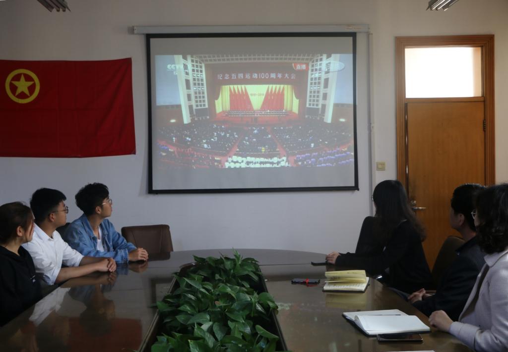 软件学院师生在会议室观看了纪念五四运动100周年大会直播。软件学院党委书记田云飞,团委书记范瑞红,辅导员郑凤华和同学们一起观看直播,聆听学习。