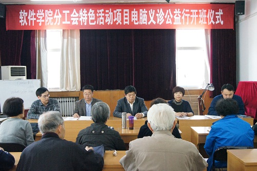 软件学院分工会特色活动项目电脑义诊公益行开班仪式在老干部楼举行。校工会副主席张月萍、离退休工作处党总书记冀贞友、软件学院常务副院长高仲合、学院教学科研工作负责人倪建成、学院分工会主席齐邦强、学院工会委员李洪亮、学院团总支书记杨正运以及我校离退休老教师30多人出席此次开班仪式。