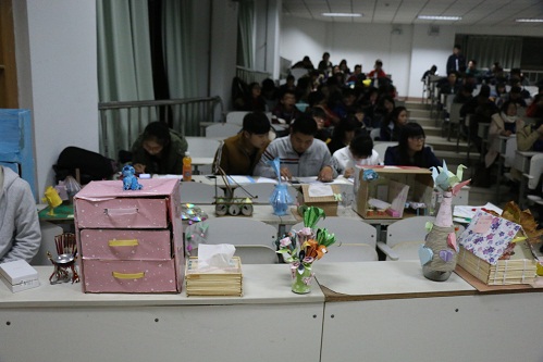 为了增加同学们的环保意识,建立“环保校园”,增强同学们的动手能力,11月14日晚,软件学院卫生部在综合楼401举办了“变废为宝”设计大赛,学生会主席团及部分一二年级的学生观看了此次比赛。