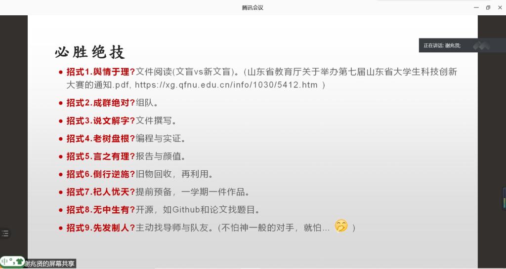 谢兆贤老师从心态调整、享受果实、角色扮演、知己知彼以及必胜绝技五个方面进行了讲解,尤其是注重知己知彼方面,他说:作为一个人,既不可妄自菲薄,也不可盲目自大,要时刻铭记人外有人,天外有天,应以谦虚的态度,努力提升自己,享受成长的过程,在日常生活中,无论做什么事,都要做到知己知彼,尤其是参加比赛,一定要熟悉比赛规则,做到透彻。对于《山东省教育厅关于举办第七届山东省大学生科技创新大赛的通知》,谢兆贤带领学生们阅读,逐句品鉴,并对同学们的疑惑做出解答,使得同学们对比赛有了清晰深刻的见解,到此,宣讲会圆满结束。