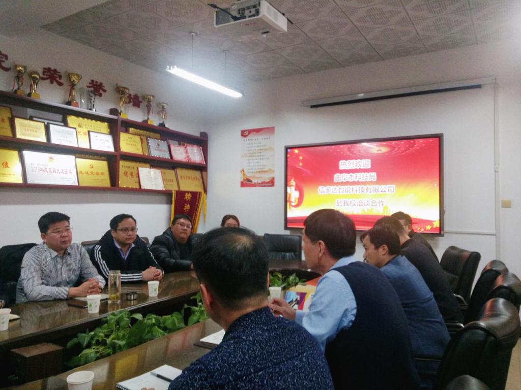会议室举行校企合作洽谈会。曲阜市科技局局长谷传超、副局长李凯、高新技术科科长高文龙;曲阜信多达智能科技有限公司总经理陈国营、总工程师孙亮;科技处开发科科长朱年磊、禁忌书屋