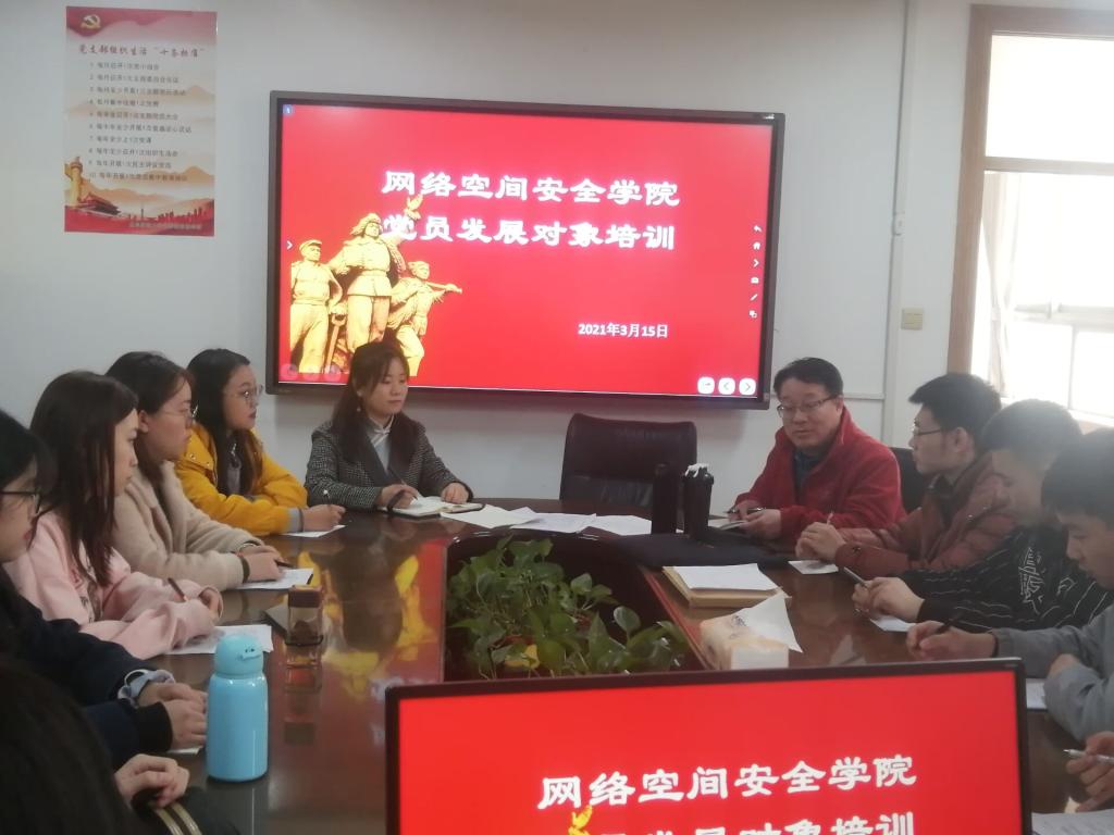在会议室举行了党员发展对象培训会议。学院党委副书记、本科生党支部书记田凯、辅导员洪亚玲、丁允念老师以及党员发展对象参加此次会议。