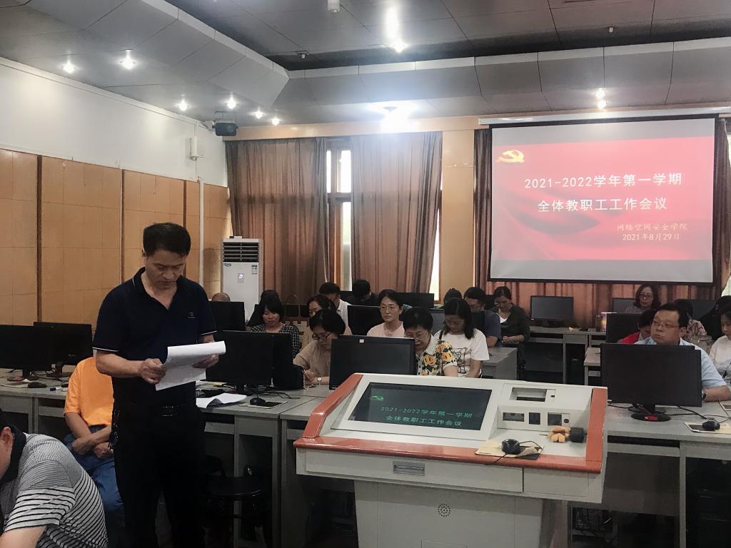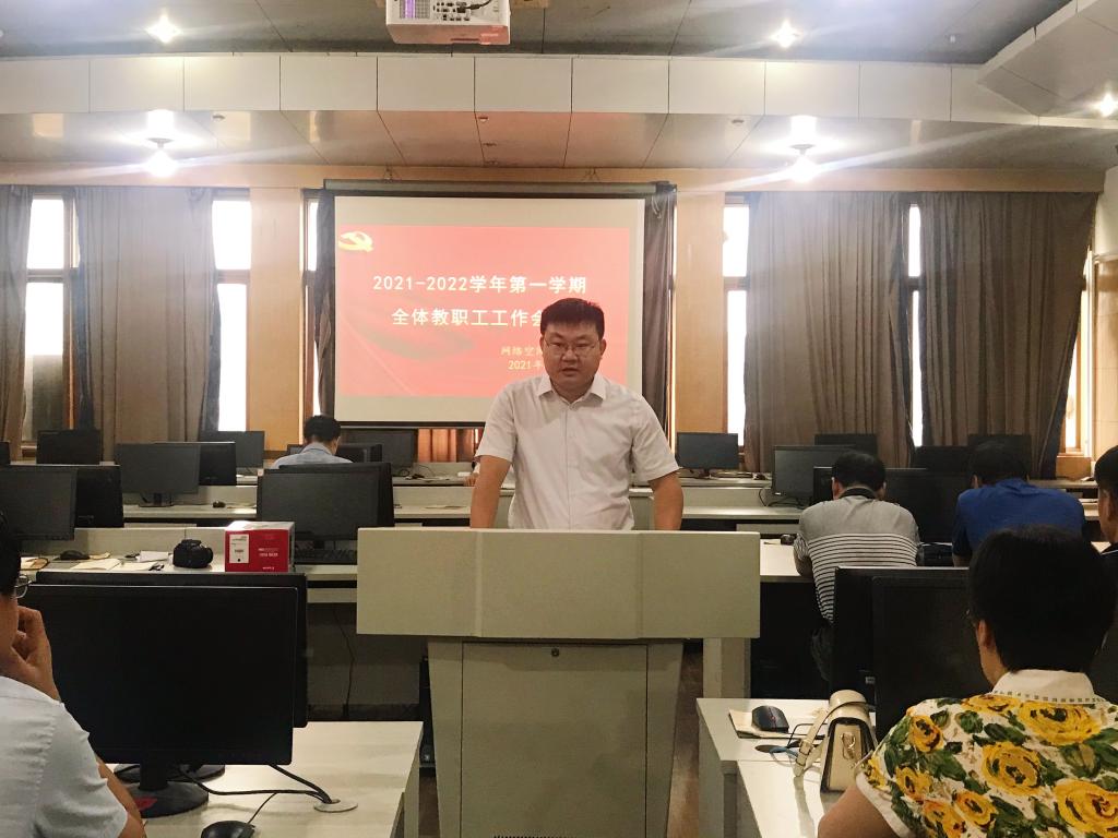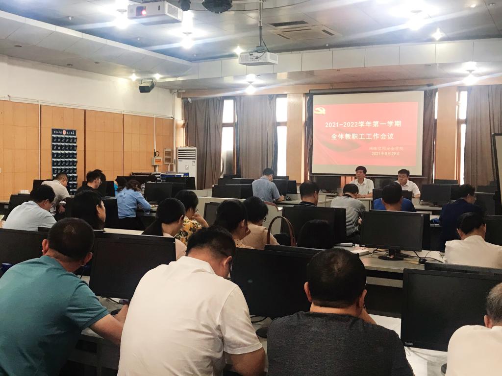 在502教室召开2021-2022学年第一学期全体教职工工作会议。学院党委书记田云飞主持,院长王茂励作《以学生为中心,全面提升教学质量》工作报告。