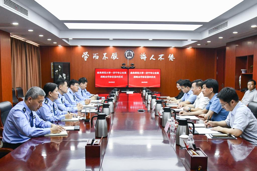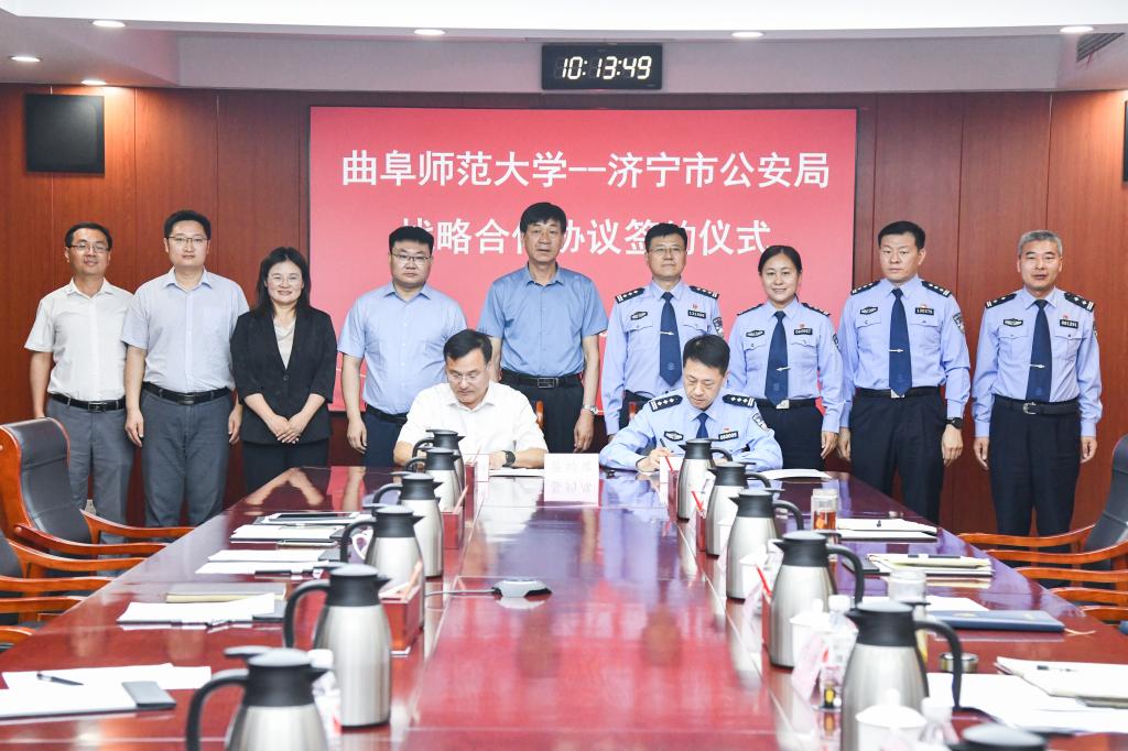 与济宁市公安局举办战略合作协议和共建实验室揭牌仪式。曲阜师大党委常委、副校长陈刚和济宁市公安局指挥中心主任王燕军代表双方签署合作协议,并为联合实验室揭牌。