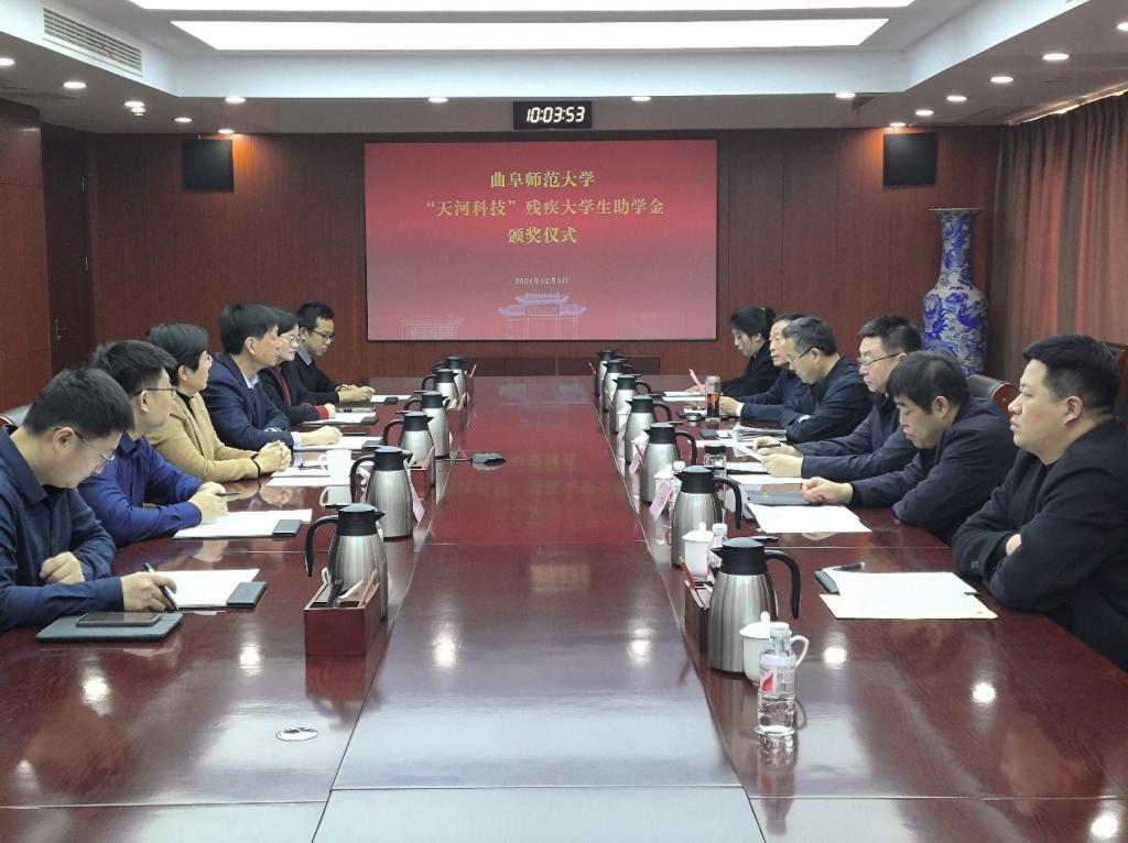 致欢迎辞。他向长期以来对学院各项工作鼎力支持的领导表示衷心的感谢和热烈的欢迎,他表示天河科技股份有限公司的助学金如冬日暖阳、及时春雨,给予了受助学生物质上的帮扶和精神上的有力鼓舞。学院也会持续关注学生成长,提供多元支持;深化校企合作,共育德才兼备的高素质人才。济宁市残联党组书记、理事长李朋在发言中对天河科技长期关注困难学生的善举表示感谢,并介绍了近年来济宁市在支持困难学生发展方面的政策与成果。