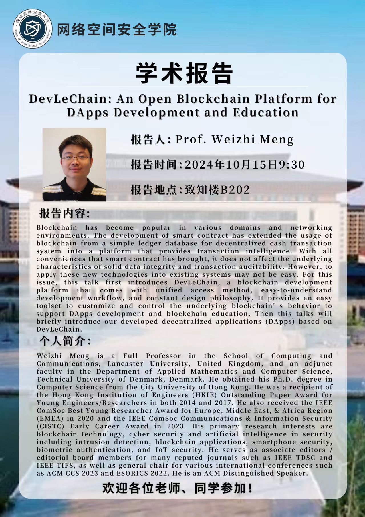 【学术报告】Weizhi Meng教授:DevLeChain: An Open Blockchain Platform for DApps Development and Education