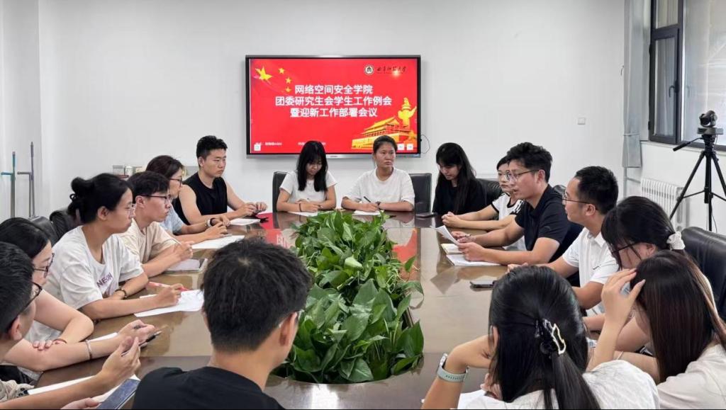 于2025年9月2日在格物楼A504召开学院团委研究生会学生工作例会暨迎新工作部署会议。研究生辅导员赵兴卯主持会议,研究生教学秘书曹腾出席会议,团委研究生会主席团及各部门部长共同参会。