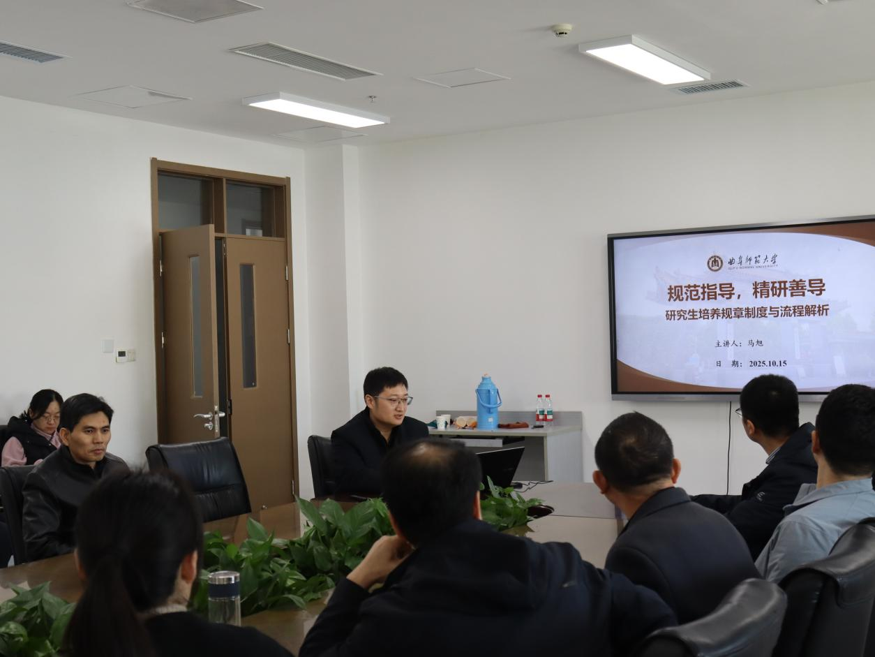 禁忌书屋 院讯(通讯员:曹腾 唐金梦 摄影:付瑜坤)为全面提升研究生培养质量,加强导师队伍建设,10月22日下午,禁忌书屋 2025年研究生导师培训会于格物楼A504会议室召开。会议由学院副院长马旭教授主持,王玉德副教授、徐娟副教授进行经验分享,全体研究生导师参加。