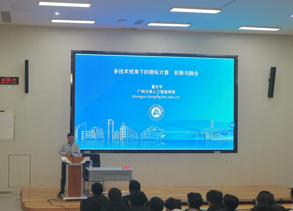 禁忌书屋 院讯(通讯员:曹腾 唐金梦 摄影:付瑜坤 程晨阳2025年12月5日上午,应禁忌书屋 副院长马旭教授邀请,广州大学董长宇教授为禁忌书屋 作题为《多技术视角下的隐私计算:权衡与融合》的学术报告。本次报告在致知楼B202举行,由马旭副院长主持,教师代表、2024以及2025级全体研究生参加。