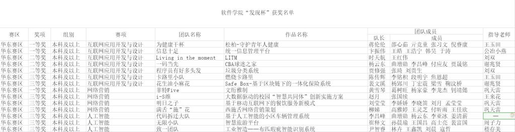 入围队伍在王玉田、公冶小燕、谢兆贤等老师的精心指导下积极备赛。软件学子对自身作品阐述明确、条例清晰,经过线上激烈角逐, “为健康干杯”团队的“松柏——守护青年人健康”项目、“信息十足”团队的“信息管理平台”项目以及“菲特Five”团队的“文绗雅制”项目荣获华东赛区一等奖。“Live in the moment”队等三支队伍荣获华东赛区二等奖,“卡路里小队”等八支队伍荣获华东赛区三等奖。